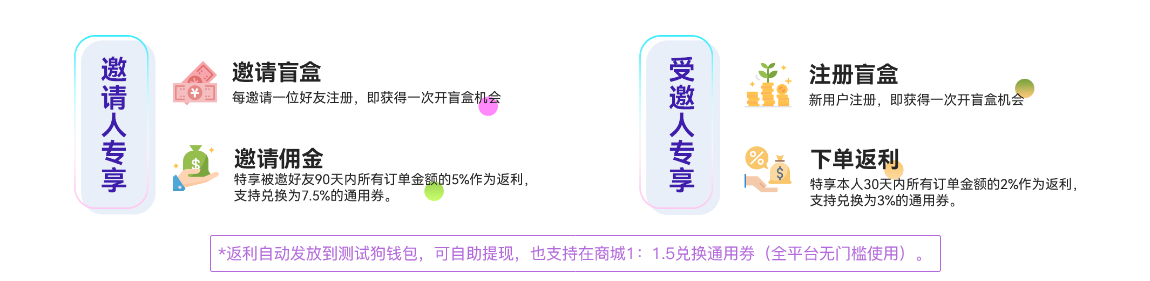 *獎(jiǎng)勵(lì)自動(dòng)發(fā)放到測(cè)試狗錢包,可自助提現(xiàn),也支持在商城1:1.5兌換通用券(全平臺(tái)無門檻使用)。