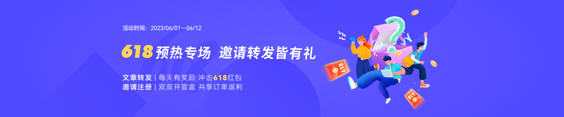活動(dòng)期間新注冊(cè)用戶可獲得一次開盲盒機(jī)會(huì)(100%中獎(jiǎng)),新/老用戶均可通過邀請(qǐng)好友注冊(cè)獲得開盲盒機(jī)會(huì)(100%中獎(jiǎng)),多邀多得,并共享訂單10.5%返利!