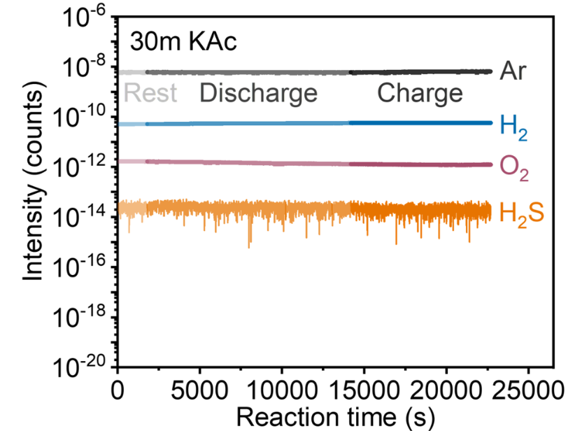作者對(duì)高濃電解液中硫電極進(jìn)行了產(chǎn)氣監(jiān)測(cè),發(fā)現(xiàn)無氫氣,氧氣或硫化氫生成,證明了硫電極在該電解液中的反應(yīng)穩(wěn)定性。