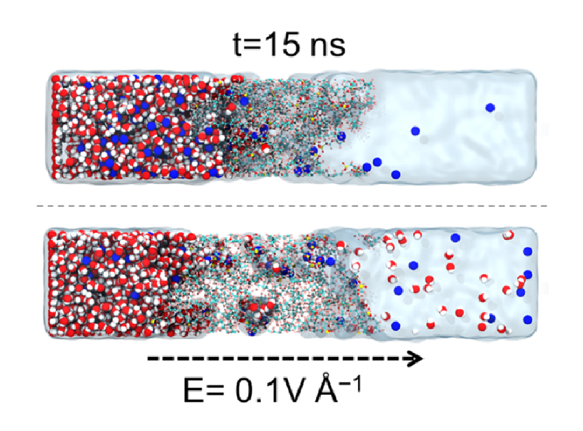 作者通過通過分子動(dòng)力學(xué)計(jì)算證明,在飽和NaOTf的電解質(zhì)中,Na?離子可以輕松穿透膜,進(jìn)一步與硫物種反應(yīng),而沒有檢測(cè)到遷移的水。相比之下,在原始電解質(zhì)中,水分子會(huì)向陰極側(cè)遷移。該研究證實(shí)了電荷載流子的貧水配位結(jié)構(gòu)可以抑制電池系統(tǒng)中的水遷移。
